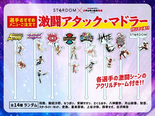 キャンペーン名:スターダム × ときわ亭コラボキャンペーン実施内容:期間中、対象店舗にてスターダム選手が選んだおすすめメニューをコラボメニューとして販売します。コラボメニューをご注文の方には、オリジナルノベルティグッズの選手マドラー(全14種ランダム)をプレゼントします。
