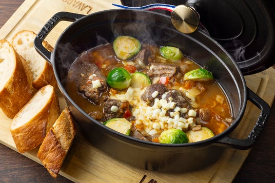 旬の海の幸と山の幸を贅沢に取り入れた冬のコースはひと皿ごとに深まる季節の移ろいを表現し、彩り豊かで華やかなテーブルを演出する全6品。前菜は脂の乗った鰤を中華テイストのカルパッチョに仕立てた一品をご用意いたします。前菜二品目には、ビールやワインと相性抜群のフライドポテトをスモークサーモン入りタルタルソースにディップして楽しむ遊び心あるメニュー。そして、スープは旬の広島県産真牡蠣とカリフラワーを合わせたクラムチャウダー。砕いた雷おこしを加えることで香ばしさと食感が広がり奥行きのある味わいに仕上げました。魚料理には冬の味覚・鮟鱇に生ベーコンを巻き付け、香ばしくカツレツに。旨みを閉じ込めた濃厚な味わいをお楽しみいただけます。 LAVAROCK自慢の肉料理にはハンガリーの郷土料理「グヤーシュ」が登場。牛肉とパプリカをじっくり煮込んだ温かなひと皿が冬の食卓に心地よいひとときをもたらします。また、同期間、チョコレートやいちごを使用した冬のカクテルも3種ご用意。冬の澄んだ空気に寄り添う香りとともに、心までほどける一杯をご堪能いただけます。