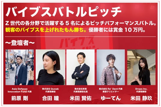 Z世代が、自分の“生き方”と“ビジョン”を4分間に込めて伝える、バイブスジャパンを象徴するコンテンツ。選抜された5名の登壇者が、自己PRでは語りきれない想いや価値観をステージで表現し、それぞれが大切にしている軸や、挑戦する理由、描いている未来を届けます。“目の前にいる観客の心を動かせるかどうか”でが評価基準で、当日は観客によるリアルタイム投票で優勝者が決まります。若者同士が互いの生き方から刺激を受け、「自分も動いてみたい」そう思える空気が会場に生まれる、イベント全体の熱量をつくり出すステージです。