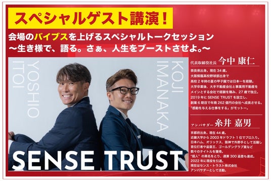 Z世代が「生き方」や「働く価値観」を知り、考えるきっかけとなる特別講演。今回は、センス・トラスト株式会社 代表取締役社長・今中康仁氏、そして同社アンバサダーでありプロ野球界の“超人”として知られる 糸井嘉男氏 の2名が登壇します。今中氏は、27歳で独立し、創業6期目にして年商262億円規模の企業へと成長させた実業家。「感動を与える仕事をする」を軸に事業を拡大させてきた、その原動力や意思決定の背景を語ります。糸井氏は、近畿大学からプロ入りし、首位打者・盗塁王など数々のタイトルを獲得したトップアスリート。圧倒的努力で道を切り拓いてきたキャリアから、「挑戦すること」「選択し続けること」の本質を伝えます。成功の形も、キャリアの形もひとつではない時代に、“どう生きるか”という問いと向き合うきっかけになる特別講演です。
