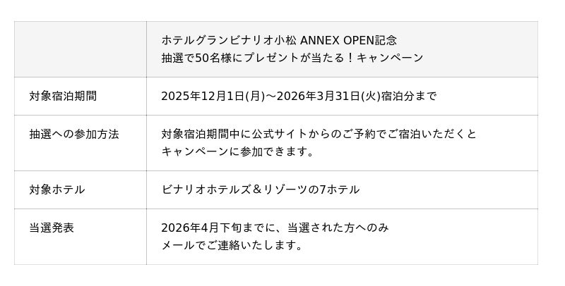 ビナリオホテルズ&リゾーツを運営する、アイアンドエフ・ビルディング株式会社(本社:大阪府北区 代表取締役社長:泉邦治)は、2025年10月23日(木)にOPENしたホテルグランビナリオKOMATSU別館のホテルグランビナリオKOMATSU ANNEXのOPEN記念として、抽選で50名様にプレゼントが当たるキャンペーンを開催いたします。