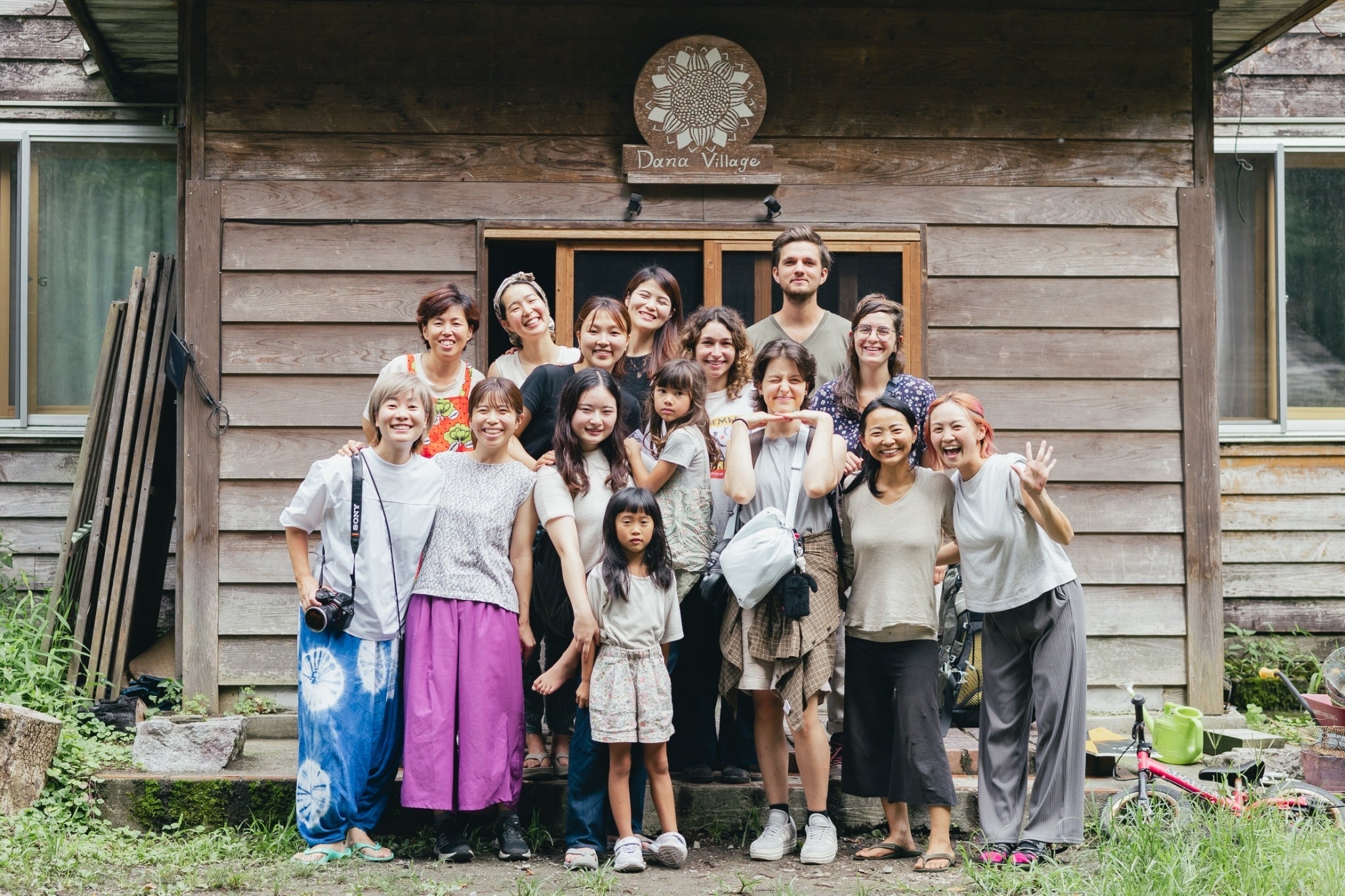 国内外から集う仲間たちとダーナビレッジ前にて。多様な背景をもつ人々が里山の暮らしを通じ、“人と地球のウェルビーイング”を共に育むコミュニティとして活動しています。