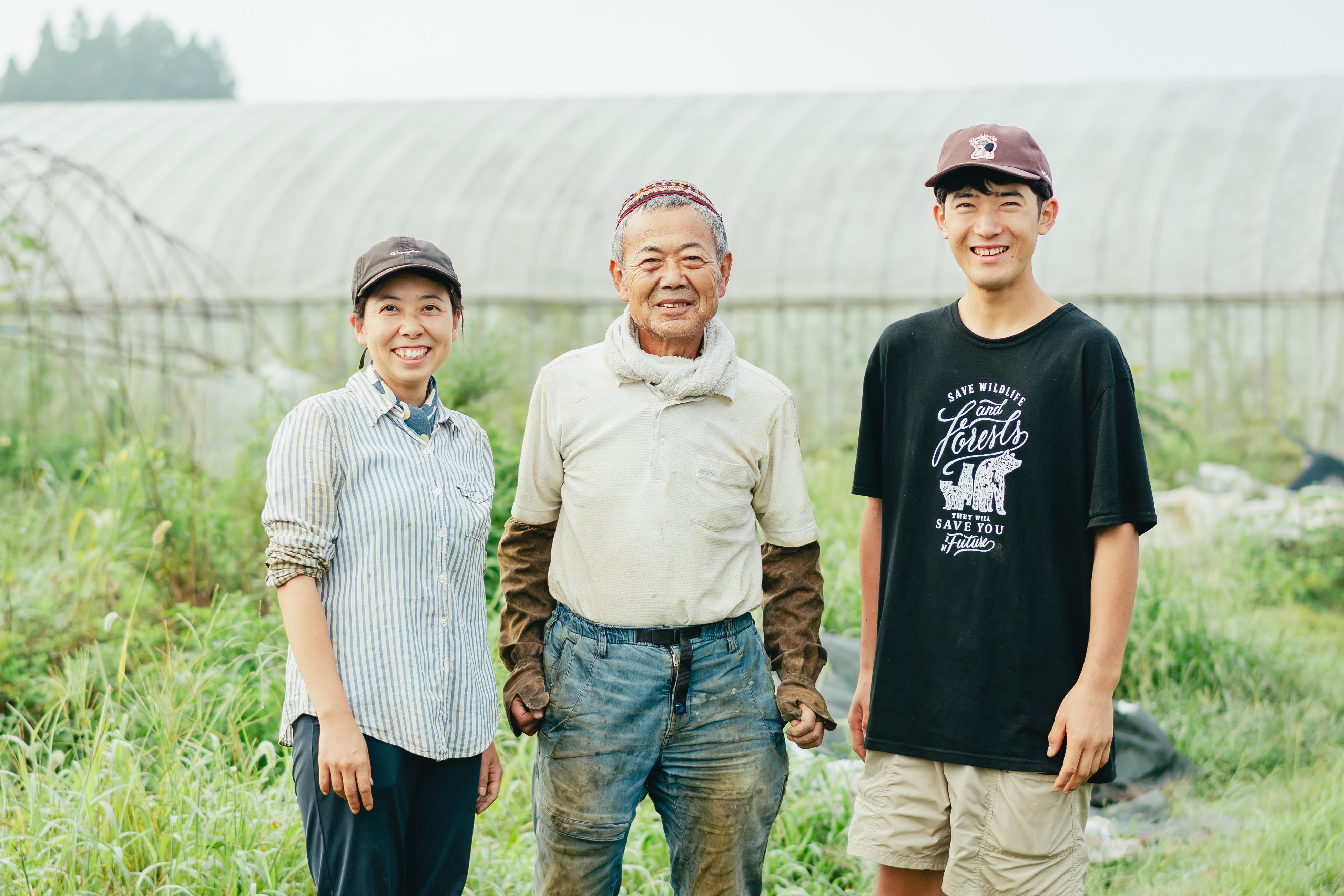 農業指導員の小川 光氏と研修生たち。40年以上続く無潅水有機農法により、メロン・ミニトマトはオーガニック・エコフェスタで日本一を二年連続受賞。地域環境に最適化したオリジナル種を育種し続け、里山から持続可能な農のモデルを発信しています。