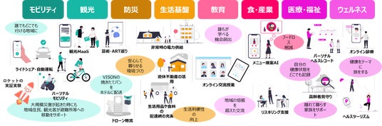 「モビリティ」「観光」「防災」「教育」「医療・福祉」など、地域が抱える地域課題に対し、企業が提案する先端技術を実装し、地域の豊かさを実感できる持続可能な地域づくりを進めていきます。