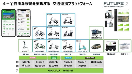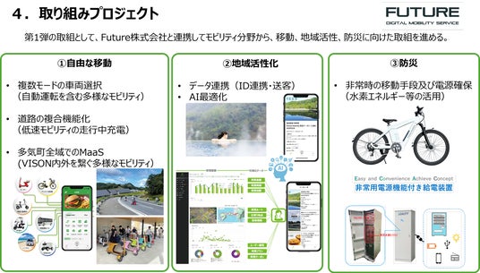 第一弾の取り組みとして、Future株式会社と連携してモビリティ分野から、移動・地域活性・防災に向けた取り組みを進める。