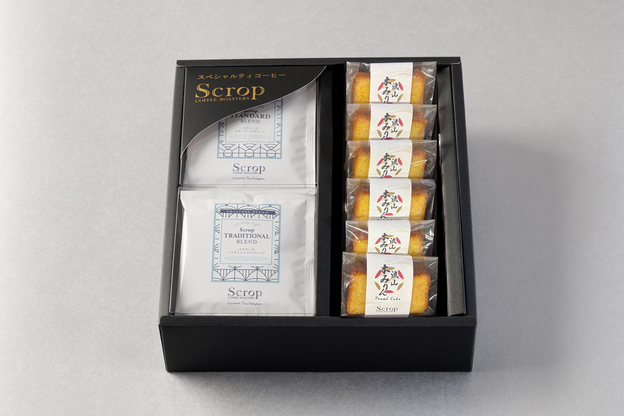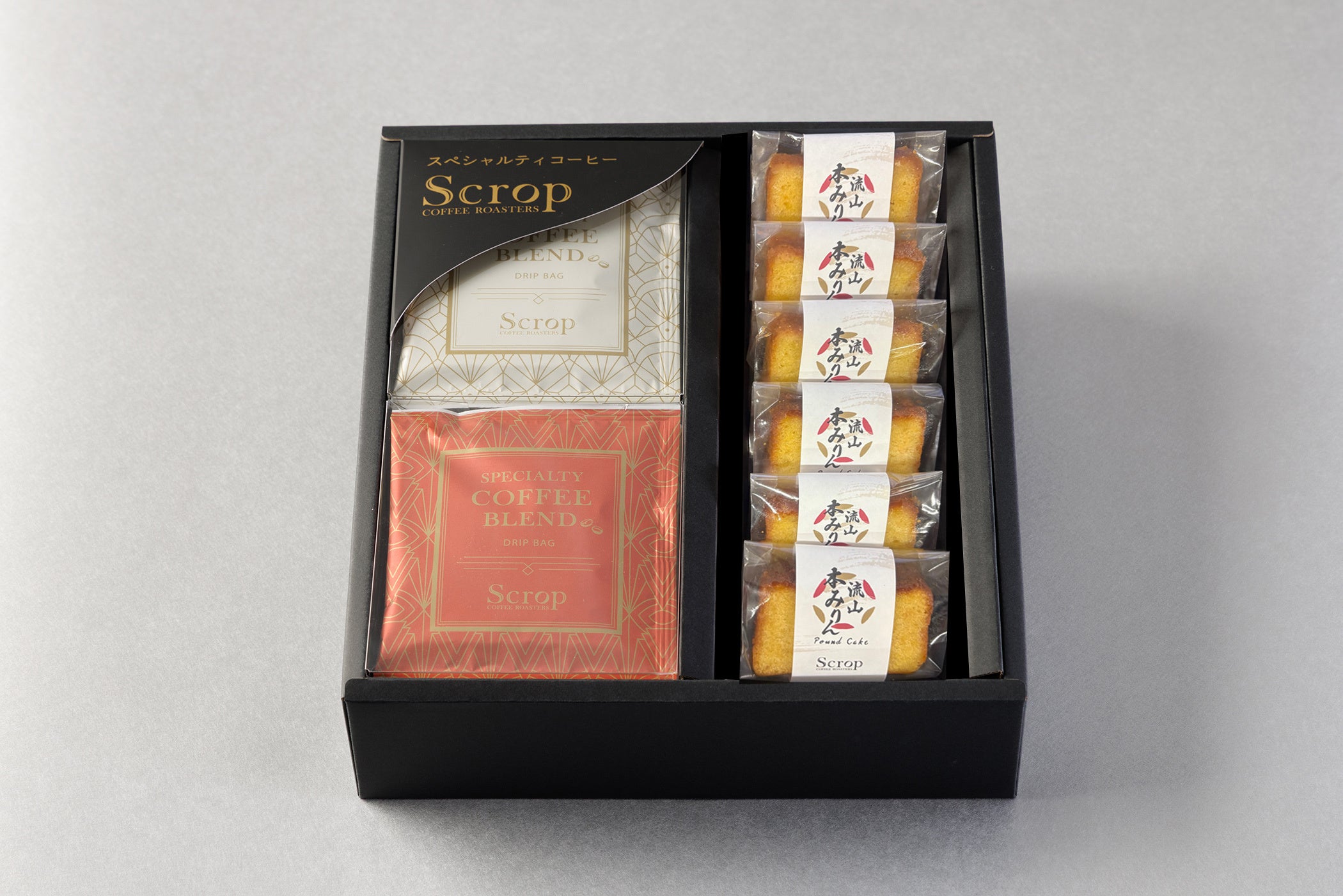 流山本みりん&こぼれ梅のパウンドケーキと、Scropの定番ブレンドのドリップバッグを詰め合わせたギフトセットです。流山の老舗「かごや商店」の「流山本みりん」と、みりんを搾る際に生まれる「こぼれ梅」を活かして焼き上げた、バターの香り豊かな自家製パウンドケーキ。やさしい甘みとしっとりとした口あたりが特長です。