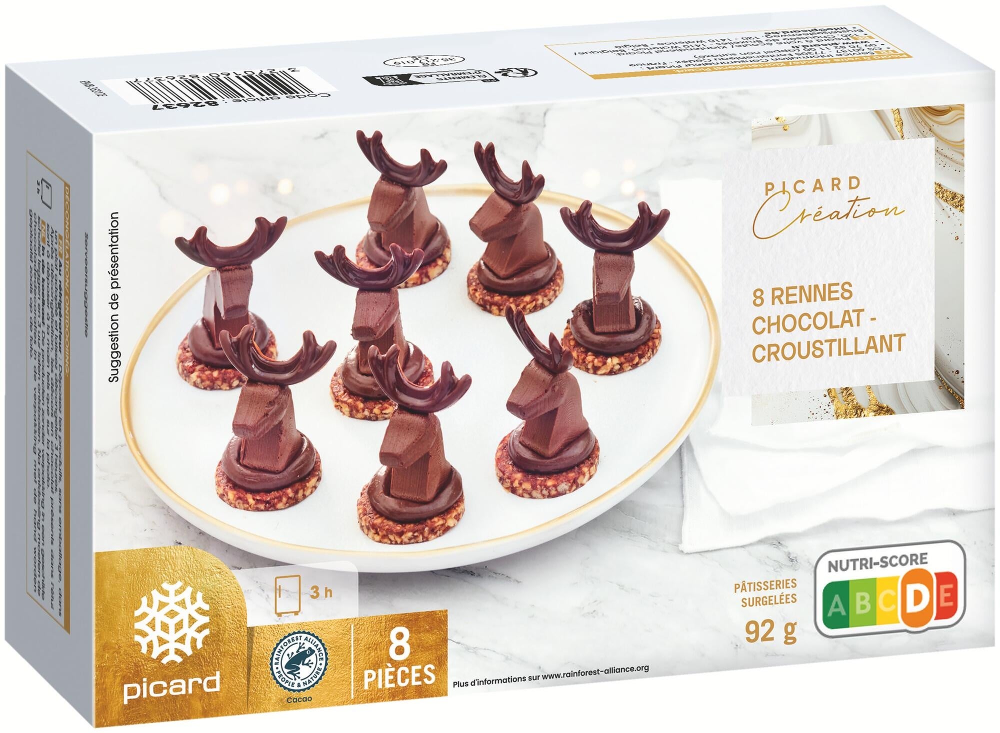 小さなトナカイ(8個入)ダークチョコレートのムースとクリーム、ヘーゼルナッツ入りのクリスピー生地を重ねたひと口スイーツ。仕上げに角を飾れば、かわいらしいトナカイに早変わり。レインフォレスト・アライアンス認証チョコレート使用で、華やかさとサステナブルを両立しました。お子さまが喜ぶのはもちろん、クリスマスケーキの飾りとしても活躍します。