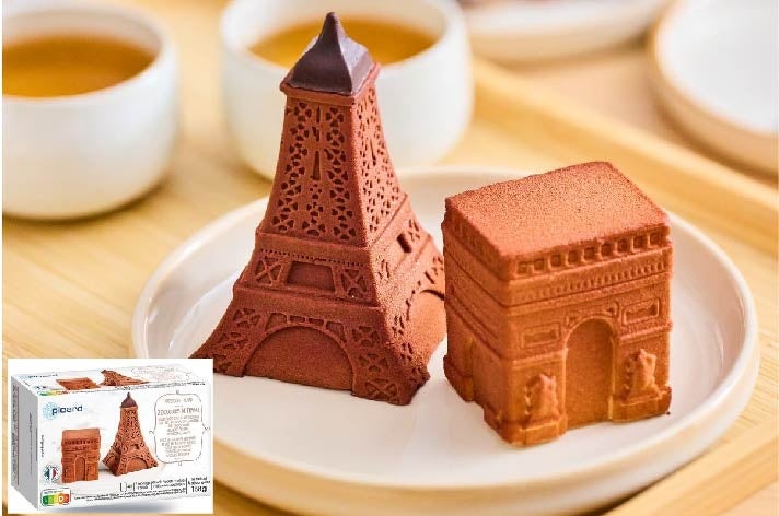 エッフェル塔と凱旋門のケーキ(チョコムースとバニラムース) 158gエッフェル塔と凱旋門をかたどった華やかなデザート。チョコレートやバニラムースに、フルーツのコンポートとサクサクの生地を合わせました。写真映えも抜群で、パリの雰囲気をそのまま食卓に運んでくれる特別感のある2個セットです。