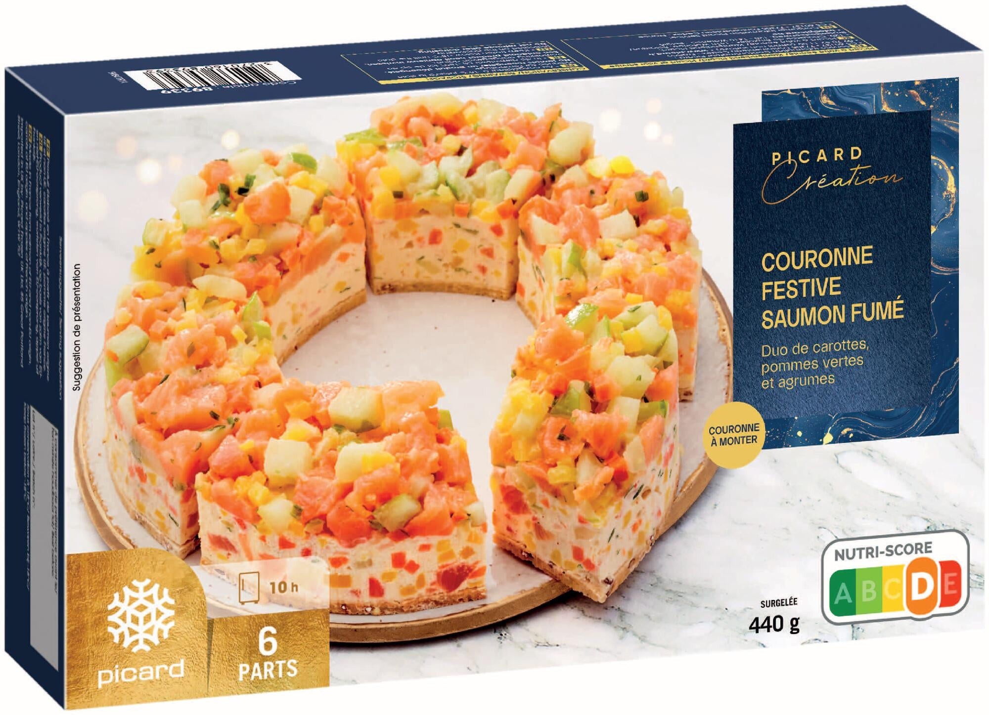 スモークサーモンとフロマージュのクーロンヌ (440g)シード入りビスケットにフレッシュチーズとスモークサーモンを重ね、ニンジン(黄色・オレンジ色)、グラニースミス(青リンゴ)、柑橘類をトッピング。6つのピースを組み合わせるとリース型に仕上がり、パーティーの最初のひと皿として並べるだけで、食卓が一気に華やぎます。