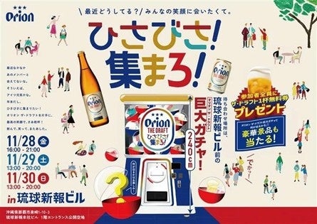 巨大ガチャ「モンスターカプセル」の企画・運営を行う株式会社グリーグローブ(本社:東京都文京区/代表取締役:上村 正治)は、2025年11月27日(木)より「沖縄拠点」を稼働させ、沖縄エリアでのレンタル事業を本格展開スタートします。さらに2025年11月28日(金)には沖縄県内初のイベントとしてオリオンビール株式会社主催、「オリオン ザ・ドラフト」友だちと過ごす“いい時間(フレンドタイム)”を応援するイベント「ひさびさ!集まろ!」に高さ2.4mの巨大ガチャ「モンスターカプセル」を提供します!2025年11月28日(金)から30日(日)までの3日間、琉球新報ビル1Fエントランスにて開催されます。