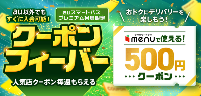menu株式会社(本社:東京都新宿区、代表取締役:大野高宏)が運営するデリバリー&テイクアウトアプリ menuは、2023年6月5日(月)より、会員数1,310万人(※2023年3月決算発表資料より)のauスマートパスプレミアム会員を対象とした、「クーポンフィーバーキャンペーン」を、2023年6月5日(月)より実施します。クーポン配布は、第1弾としてローソン・すき家が対象で、期間は6月5(月)から6月11(日)までとなります。その後4週にわたり実施を予定しており、第2弾はケンタッキーフライドチキン・スシロー、第3弾はガスト、サーティワンアイスクリーム、第4弾はほっともっと・スープストックトーキョーなどの、menu内における人気店が対象となります。