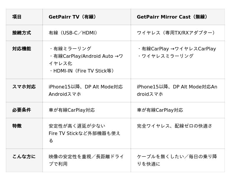 そこでGetPairrは、スマホの画面をそのまま車に映すミラーリングを重視し、用途に応じて「有線/無線」を選べる2製品を開発しました。