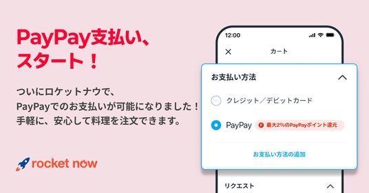 ■キャッシュレス決済サービス「PayPay」の導入で利便性を強化フードデリバリーサービス「ロケットナウ」では、決済方法としてキャッシュレス決済サービス「PayPay」を導入しています。これにより、ユーザーの皆さまには、より安心で簡単にサービスをご利用いただくことができ、外出先や忙しい時間帯でも、スマートフォンひとつでスムーズにご注文いただけます。また、「PayPay」でのお支払いにより、最大2%の「PayPayポイント」(*1)が付与されるため、便利さに加えてお得さも実感いただけます。