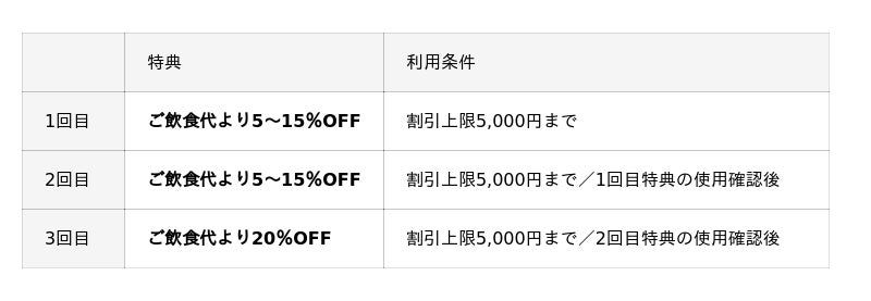 ・「3回目特典(20%OFF)」は「2回目特典」をご利用いただいた方のみ適用となります。