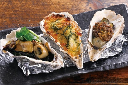 「焼き牡蠣三種食べ比べ」は、「九州甘醤油」「チーズパン粉」「濃旨牡蠣味噌」の3種の味をご堪能ください。冬限定の贅沢なメニューです。