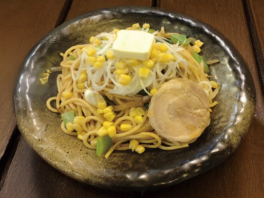 「味噌ラーメン風 焼きスパ」は、モチモチ食感のスパゲティを特製味噌スープで豪快に炒め上げた一品。味噌の濃厚な香りとコクを麺に染み込ませながら、シャキッと火が通ったもやしの歯ざわり、はじけるコーンの甘さ、チャーシューの旨味を一体化しています。仕上げにひとかたまり落としたバターがゆっくり溶け、味噌の香りと溶け合って、ツヤとコクが一気に深まったところに、トッピングの白ネギがアクセントとなり、初体験ながらなぜか懐かしい味わいが口に広がります。どこか新しくて、どこか懐かしい一皿をどうぞ。