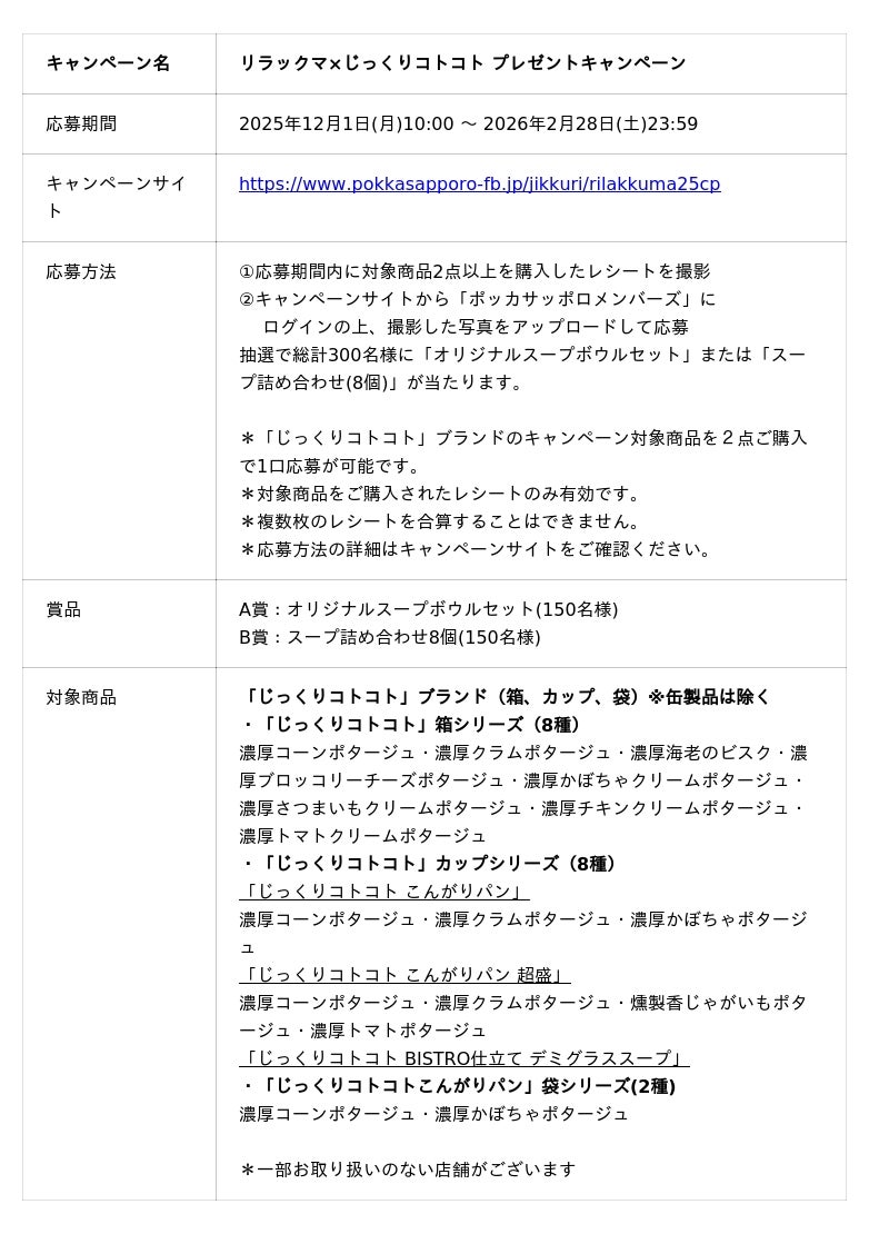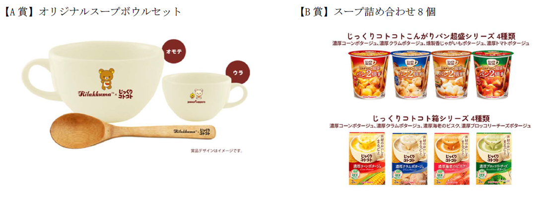 これから年末年始を中心に、寒さが一段と厳しくなりまた何かと慌ただしくなるシーズンを迎えます。当社ではそんなシーズンにぴったりの“とろ~り濃厚”で温かくてほっとするスープ「じっくりコトコト」ブランドと、ゆるりと親しみのある人気キャラクター「リラックマ」がコラボレーションし、抽選で総計300名様に賞品が当たるプレゼントキャンペーンを実施します。