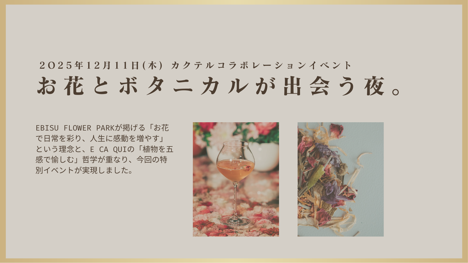 EBISU FLOWER PARKが大切にしてきたのは、「お花で日常を彩り、人生に感動を増やす」という理念。E CA QUIが掲げる、「植物の香りや味、その奥にある文化ごと愉しむ」という思想。