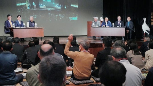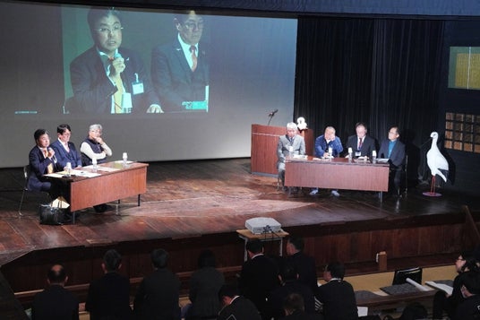 写真=豊岡市の門間市長(左)らがコウノトリと共生する農業の成果と課題を議論したパネルディスカッション