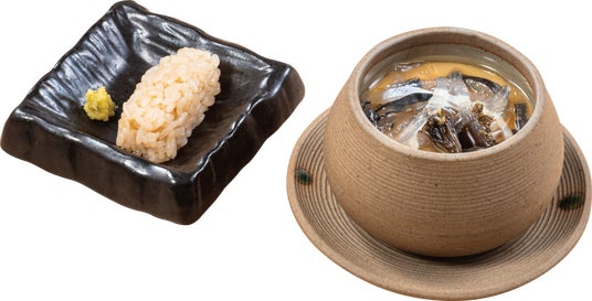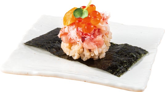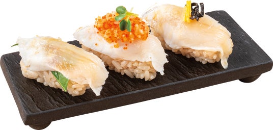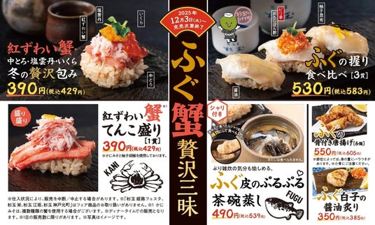 今回の目玉商品は、ふぐを堪能できる「ふぐの握り 食べ比べ[3貫]」です。弾力のある身が特長のふぐに、醤油、大根おろしと一味唐辛子、柚子昆布をそれぞれトッピングし、一皿で3種類の味を楽しむことができます。また、冬の味覚である蟹を使用した寿司が登場します。「紅ずわい蟹・中とろ・塩雲丹・いくら 冬の贅沢包み」は、紅ずわい蟹のほぐし身、中とろのたたき、塩雲丹、いくらを一度に味わえる、まさに贅沢な一貫です。「紅ずわい蟹 てんこ盛り[1貫]」は、シャリとネタの間にかにみそと柚子胡椒を混ぜたものをのせ、紅ずわい蟹の棒肉とほぐし身をふんだんに盛り付けました。その他、ぷるぷる、こりこりとした食感が特長の千切りのふぐ皮とふぐのヒレをトッピングした「ふぐ皮のぷるぷる茶碗蒸し」は、お好みのタイミングでシャリを加えて混ぜると、ふぐ雑炊としてもお楽しみいただけます。さらに、骨付きふぐを店内で揚げた「ふぐの骨付き唐揚げ[6個]」や濃厚でクリーミーな味わいの白子に醤油を纏わせて炙った「ふぐ白子の醤油炙り」などの一品料理も取り揃えております。