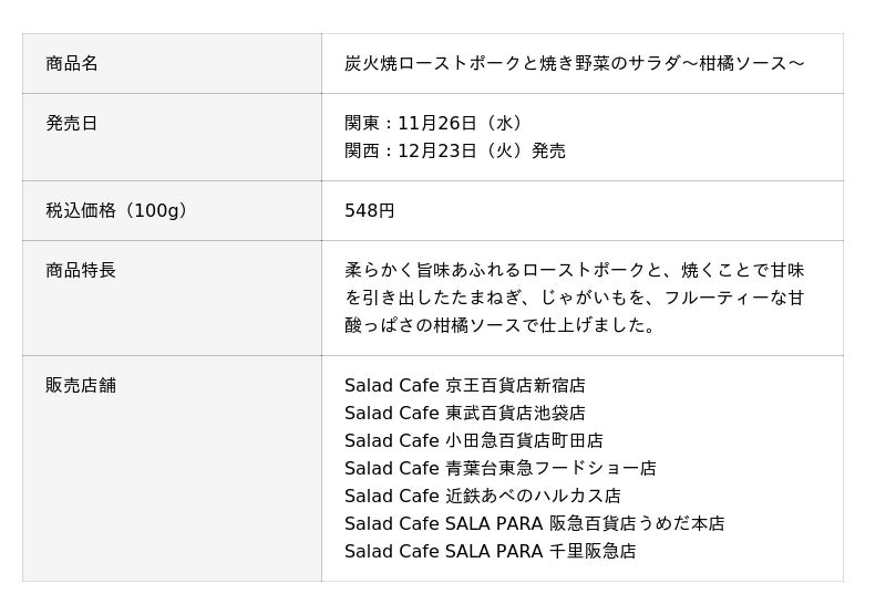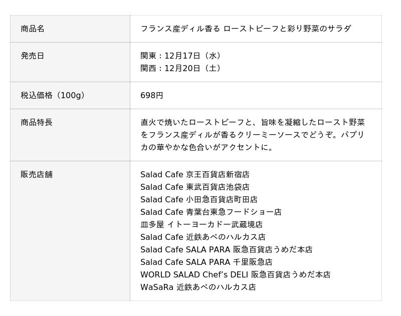 今年の新商品は、クリスマスメニューとして人気の高いローストポークとローストビーフ、それぞれを使った2種類のサラダです。『直火焼ローストポークと焼き野菜のサラダ~オレンジ香る柑橘ソース~』は、直火で焼いた柔らかなローストポークと香ばしい焼き野菜をフルーティーな甘酸っぱさの柑橘ソースで仕上げました。贅沢にトッピングしたオレンジの爽やかな風味と旨味のあるローストポークの相性がよく、食欲をそそります。『フランス産ディル香る ローストビーフと彩り野菜のサラダ』は、ローストビーフと、焼いて旨味を凝縮したじゃがいも、カリフラワー、たまねぎ、パプリカを、フランス産のディルが香るクリーミーソースで味わうサラダです。彩りが良く、特別な日の食卓を見た目にも楽しく華やかに演出します。