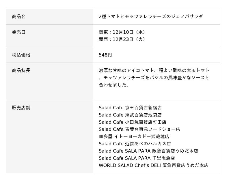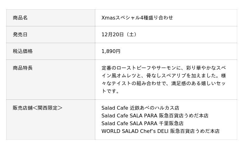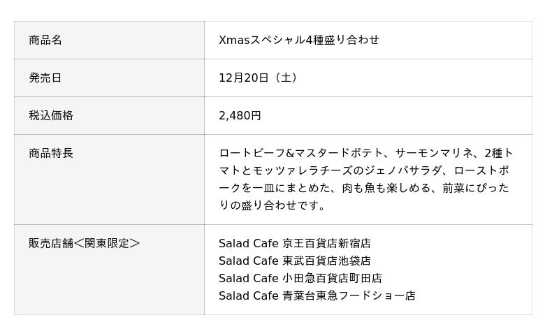 ケンコーマヨネーズ株式会社(所在地:東京都杉並区、代表取締役社長:島本 国一)の100%子会社であるサラダカフェ株式会社(所在地:大阪府吹田市、代表取締役社長:石井 健夫、以下「サラダカフェ」)は、百貨店やショッピングモールを中心に、彩り豊かなサラダや総菜を販売するサラダショップを展開しています。12月を迎え、ホリデーシーズンが盛り上がる中、今年は新商品2品を含む多彩なメニューをラインナップ。あわせて、本日特集ページを公開し、クリスマスの特別なひとときを彩るおすすめ商品をご紹介します。