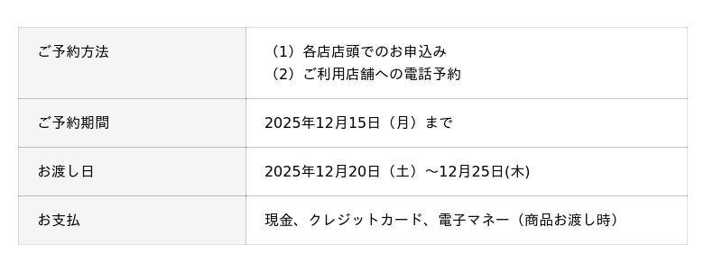 クリスマス期間は店舗の混雑が予想されるため、ご購入をご希望の方は、事前のご予約をおすすめしております。ご予約がない場合でも店舗で販売がございましたらご購入可能です。掲載商品の販売状況については、ご利用店舗までお問い合わせください。