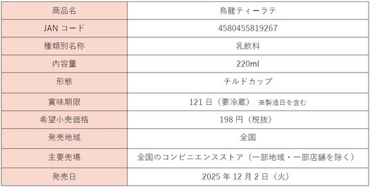 トーヨービバレッジ株式会社(本社:東京都渋谷区、代表取締役社長:熊谷聡)は鉄観音茶を使用した「烏龍ティーラテ」を2025年12月2日(火)より全国のコンビニエンスストアにて順次発売いたします(一部地域・一部店舗を除く)。