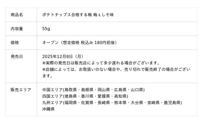 カルビー株式会社(本社:東京都千代田区、代表取締役社長兼CEO:江原 信 以下、カルビー)は、福岡県立福岡農業高等学校(福岡県太宰府市、以下、福岡農業高校)と共同で開発した受験生を応援するポテトチップス『ポテトチップス合格する梅(ばい) 梅ぇしそ味』を2025年12月8日(月)から中国・四国・九州・沖縄で数量限定発売します。商品はなくなり次第終了となります。※コンビニエンスストアでの取扱いはありません。