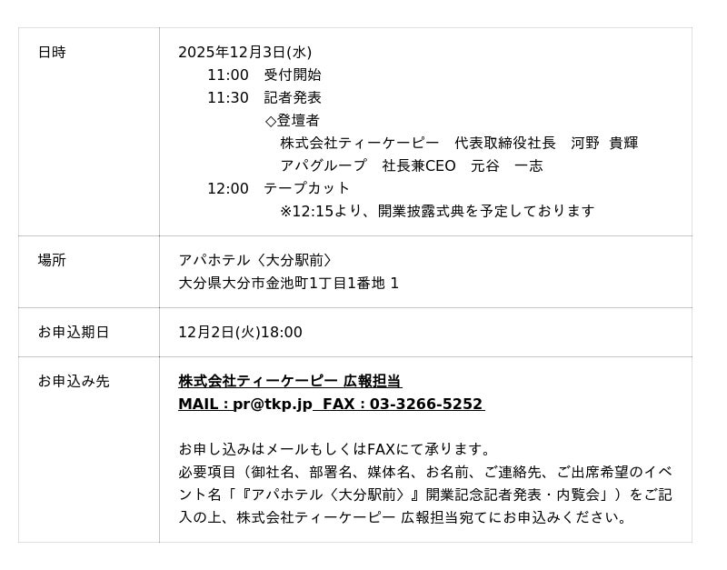 TEL:03-6843-0011 MAIL:pr@tkp.jp