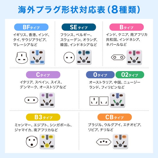 8種類のプラグに対応するため、これ1つでほぼすべての国の電源プラグを日本仕様(Aタイプ)に変換できます。海外からの旅行者や、海外製品を日本で使いたい方に最適です。