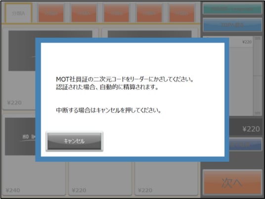 ・MOT 社員証アプリの二次元コードを券売機のバーコードリーダーで読み取らせる。
