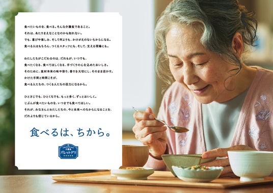 このたび新たに制定したブランドメッセージ「食べるは、ちから。」とステートメントは、福祉・医療現場の最前線から寄せられる「ご利用者の食事満足度を上げたい」「介護食の栄養価を底上げしたい」という声に真摯に向き合いながら、介護食の開発・製造・提供をしているベネッセパレットの想いを表しています。この制定を機に、食事を召し上がっていただくご高齢者はもちろんのこと、調理現場の職員、介助する職員の“ちから”になり、すべての人が“おいしく食べること”を通じて元気になれる社会の実現を目指してまいります。