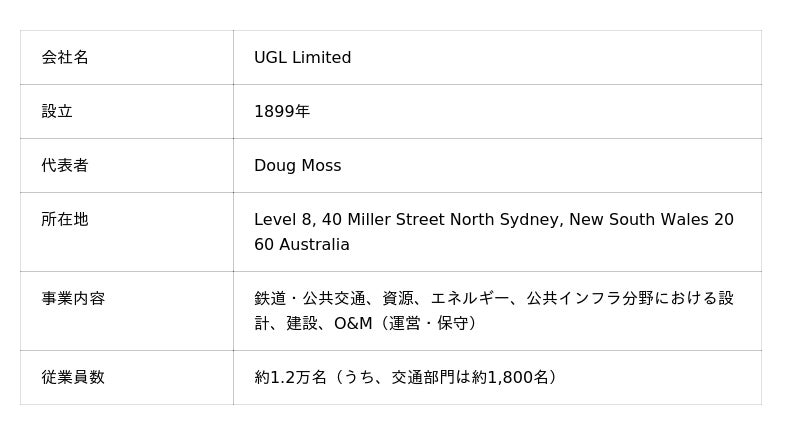 UGLの交通部門は、豪州で、鉄道O&Mサービス、鉄道車両製造、公共交通システム整備を包括的に提供するリーディングカンパニーです。1899年の設立以降、シドニー、メルボルン、キャンベラなどで鉄道やライトレール(LRT)、バス運行などの多数のプロジェクト受注実績があります。また、旅客車両のO&Mに加え、豪州内での鉱物資源輸送に不可欠な機関車・貨車の製造およびメンテナンスなど、幅広いサービスを展開できる強みを有しています。