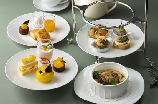 セイボリーには、定番のスモークサーモンにアボカドとオニオンルージュを合わせたサラダをはじめ、パテ・ド・カンパーニュのピンチョス、クルヴェット&エッグのプチタルト、ロルティーニカナッペなど、一口で味わえる見た目も上品な品々をご用意しました。さらに、温かいメインセイボリーとして、旨み豊かな仙台牛入りハンバーグを、カリーソースとバターライスとともにお楽しみいただけます。ボリュームたっぷりで、満足感のあるアフタヌーンティーです。