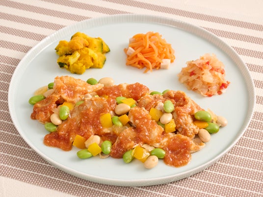 副菜は、スパイス香るかぼちゃサラダ、ベーコン入りにんじんソテー、赤ピーマン入りの彩りコールスローです。