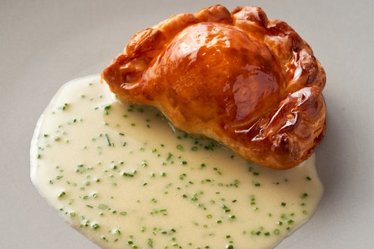 瀬戸内産鯛とトマト、ホウレン草のパイ包み焼き アンチョビ風味のバターソース