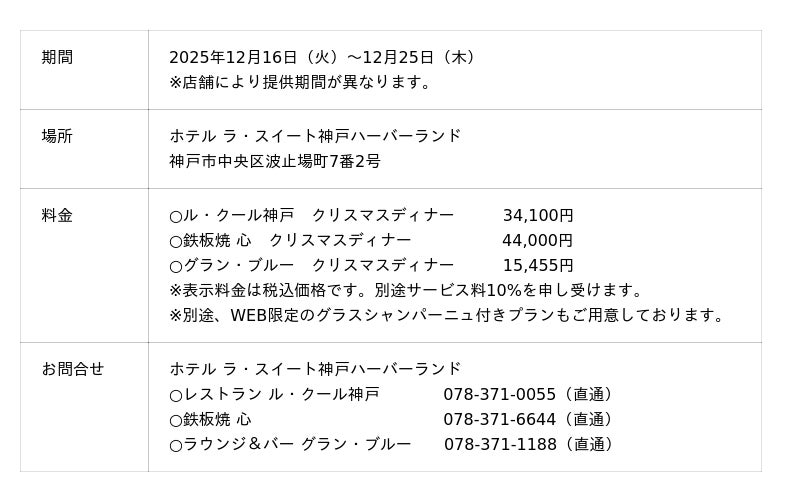 ホテル ラ・スイート神戸ハーバーランド(総支配人:檜山 和司 所在地:神戸市中央区)では、2025年12月16日から12月25日まで、「レストラン ル・クール神戸」「鉄板焼 心」「ラウンジ&バー グラン・ブルー」の3店舗にて、クリスマス限定ディナーを提供いたします。