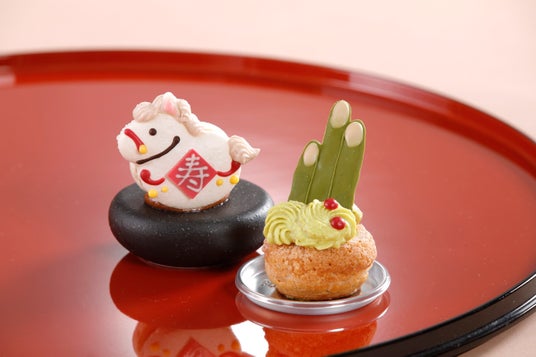 ・門松に見立てたピスタチオとチェリーのシュークリーム