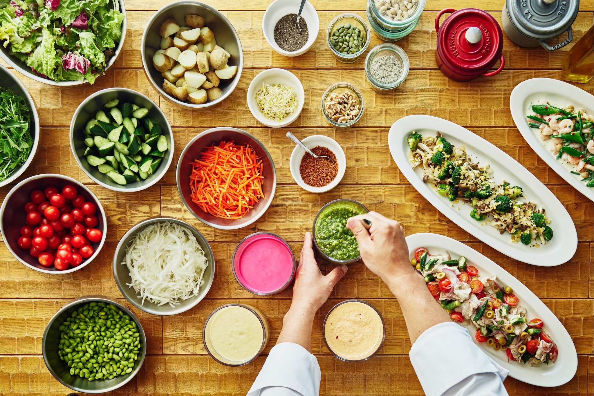 - ご褒美おむすび:炊き立てご飯と、定番×変わり種の具材を目の前で握る4種の人気おむすびメニュー 身体喜ぶ 15品目の新鮮野菜のサラダブッフェ:新鮮なサラダバーに、ホテルメイドの色鮮やかなドレッシング4種とデリ3種