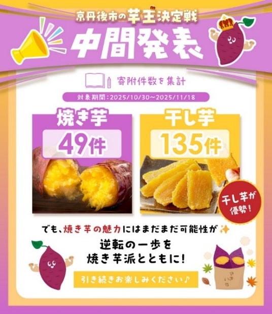 中間発表では干し芋が優勢!焼き芋は逆転できるか?!10月30日~11月18日までの期間で寄附件数を集計すると、干し芋派が優勢!!でも焼き芋の魅力にはまだまだ可能性が!!
