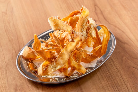 薄くスライスしたごぼうをカラッと揚げ、ブラックペッパーとパルメザンチーズで味付けをした揚げつまみ。