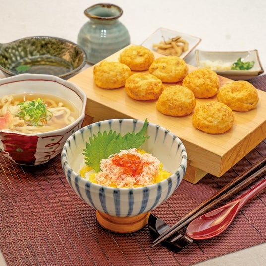 甘みたっぷりの紅ズワイガニとプチプチ食感のいくらの濃厚な海の幸を味わい丼と特製お出汁が効いた、ふわとろ食感の名物玉子焼(明石焼)、温かいお出汁香るうどんが付いた旬を味わう玉子焼セットメニューです。