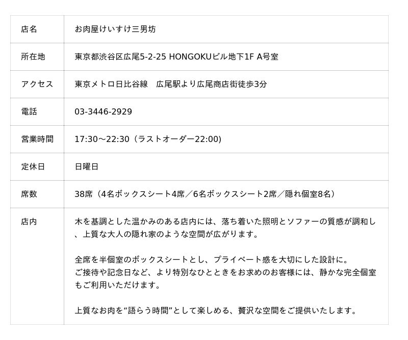 東京・広尾の人気焼肉店『お肉屋けいすけ三男坊』(運営:株式会社スマイルキューブ|代表取締役社長:井上 景介)は、2025年12月3日より“裏コース”として飲み放題付き15,000円(税込)の新コース《人 - jin -》を初公開いたします。