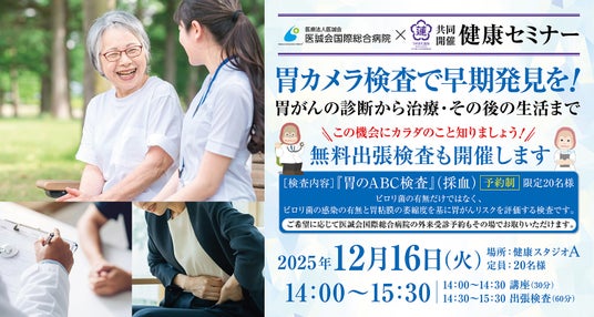 講座後は健康啓発のため、採血による『胃のABC検査』(ピロリ菌感染の有無と胃粘膜の萎縮度を調べる検査)を実施します。未来の自分の健康について考えてみませんか。検査結果によっては、医誠会国際総合病院での外来受診予約も可能です。