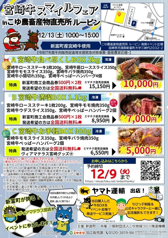 こゆ農畜産物直売所ルーピンにて、「宮崎牛スマイルフェア」を開催します!新富町産の宮崎牛を使用した、お得な限定BOXのご予約を受け付けています。購入特典として、会場でのお手続きで全国送料無料や新富町商工会商品券をプレゼントいたします。(Aセットは500円券×2枚、Bセットは500円券×1枚)年の瀬に、食卓を宮崎牛で彩りませんか。数量限定となりますので、お早めにご注文下さい!
