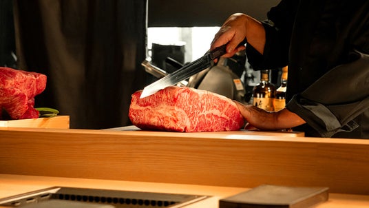 木造りカウンターの前で、職人が包丁を入れ、丁寧に肉を捌く所作。
