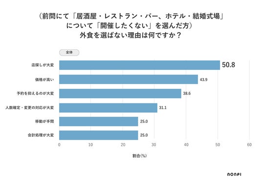 前問の「居酒屋・レストラン・バー、ホテル・結婚式場」について「開催したくない理由」を聞いたところ、「店探しが大変」が50.8%、「価格が高い」が43.9%、「予約を抑えるのが大変」が38.6%となりました。