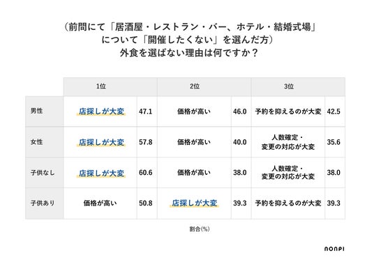 一方、開催場所の希望では従来の居酒屋が1位であるものの、2位に「オフィス開催」が入り、新たな忘年会スタイルが支持を集めています。また、居酒屋を敬遠する理由として「店探しが大変」「価格が高い」が挙がり、女性や子育て世代で負担感が顕著でした。