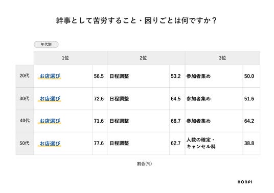 今回の調査では、忘年会幹事の最大の悩みが「お店選び」であることが判明し、とくに40・50代の“ベテラン幹事世代”で負担が強く表れました。